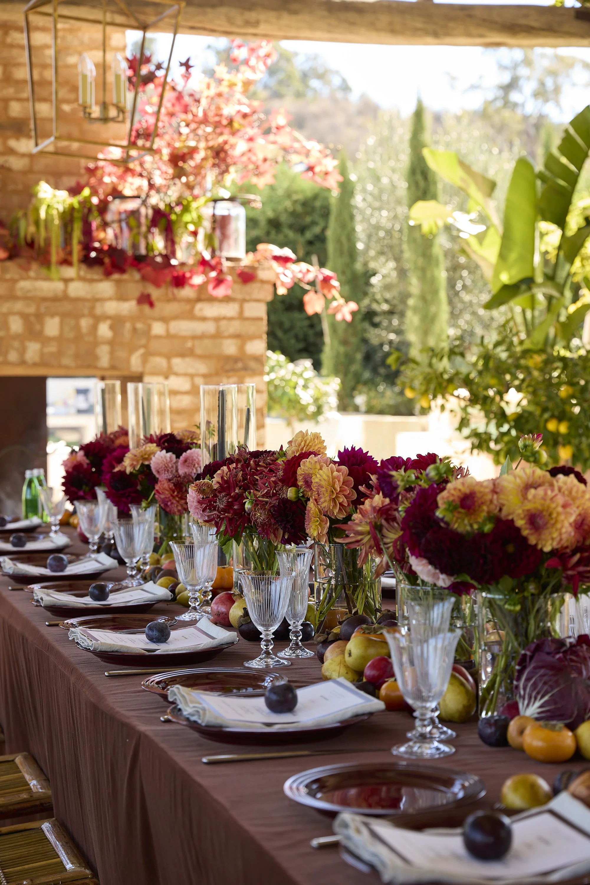 The table was styled with a custom velvet tablecloth, Autumn tone dahlias, and abundant fruits and vegetables, along with black candles and cut crystal glassware.
