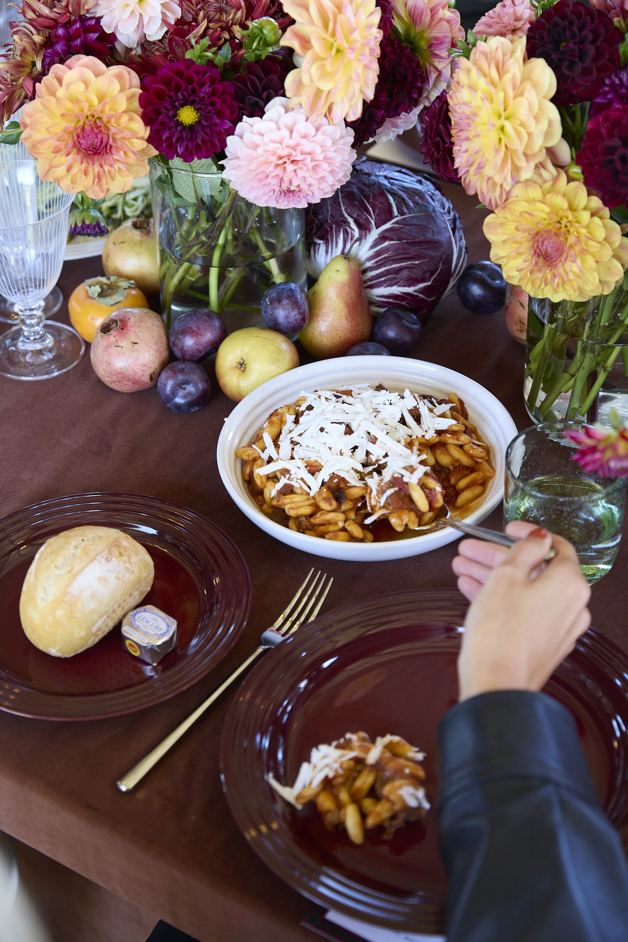 From there, guests wandered over the pool area and Orangery to enjoy a decadent Autumn feast created nay Amanda from The Cordony Kitchen. The table was set in an array of rust and burgundy tones, heroing this year’s new Le Creuset colour RHONE, with the table set with stoneware.